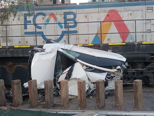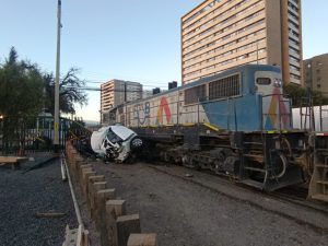 Un convoy de trenes de la empresa férrea FCB que transitaba de sur a norte colisionó con u. automóvil particular en la intersección de Balmaceda con Atacama, dejando a dos personas extranjeras con lesiones leves, pero destrozando completamente el pequeño vehículo de color blanco.